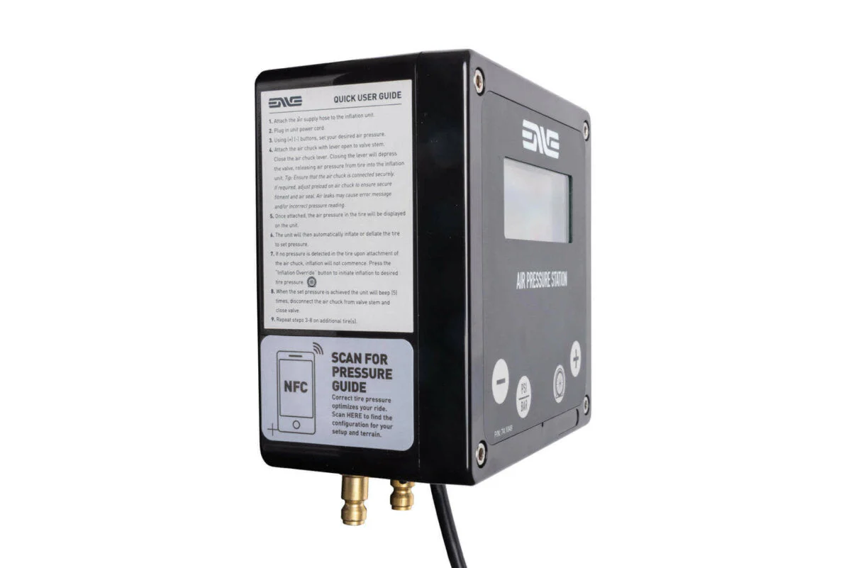 The ENVE Air Pressure Station is an automatic digital inflator that helps to seat, and accurately inflate any tire to within a .5% of a psi or bar. The Air Pressure Station connects to your existing air compressor, or bottled air and mounts cleanly on any wall or surface for an instant upgrade to your garage, service shop, van, or trailer. The unit features a digital interface, three tire pressure presets, tubeless tire/flat tire override function for safe and efficient tubeless tire seating, and a mobile device scannable NFC tag that directs the user to ENVE’s latest tire pressure recommendation charts. Unit includes a 15 foot coiled air hose, fittings, and custom ENVE adjustable presta valve air chuck.